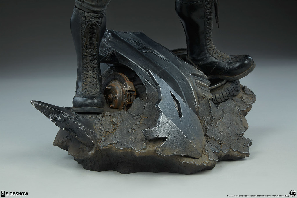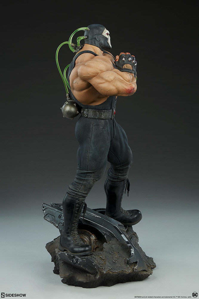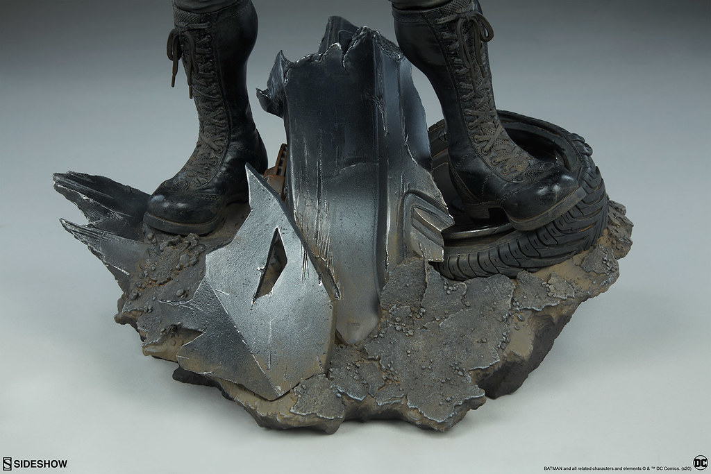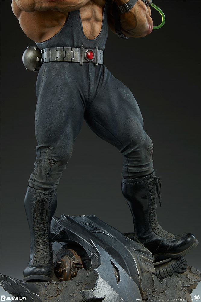 本次的「班恩 Maquette」高度來到極具份量的 66 公分,根據漫畫設定形塑出魁武的身形與誇張的肌肉線條,正在彎折手指的動作讓人似乎在耳邊聽到了骨頭的「喀喀」聲響,暴起的青筋跟位於指節、手肘的血跡更提升了本作的兇暴程度,正當我們在想「誰是被班恩狠揍的倒霉鬼,該不會又是......」的時候,就看到了底座散落著蝙蝠車的殘骸真的幫QQ;另外,黑色摔角服的髒污與破損、注射藥劑的透明細管與裝置也有出色的表現。