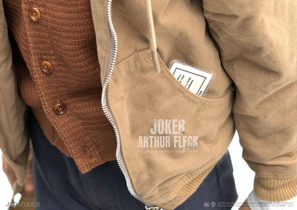 「亞瑟·佛萊克」1/3比例比例超現實電影雕像,尺寸全高約 65 公分,將《小丑 Joker》劇中脆弱且壓抑的亞瑟·佛萊克完美再現!由JND Studios創始人之一的韓國頂尖造型師 KOJUN 設計製作出高度還原瓦昆·菲尼克斯的頭雕,使用矽樹脂,玻璃眼球與人造植髮打造出極致的真實感,臉部的細紋、毛孔與黯淡的眼神、緊閉的雙唇等細節皆栩栩如生,散發出劇中的情感。