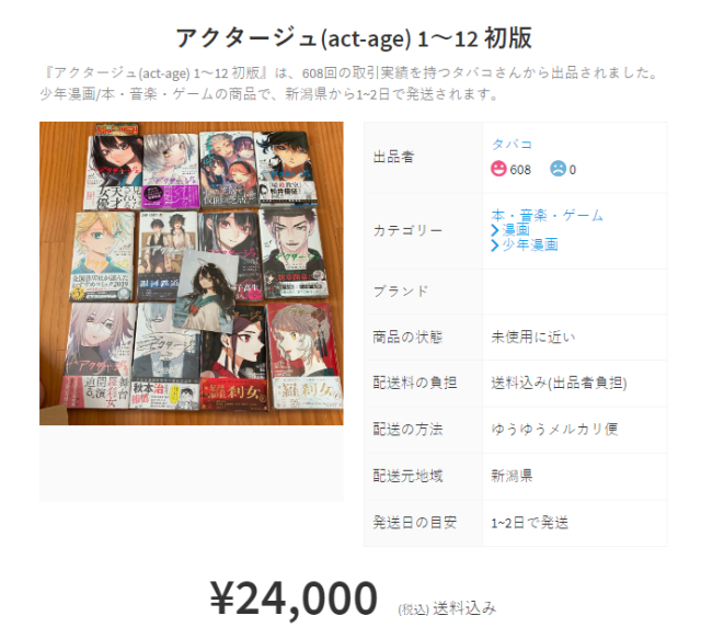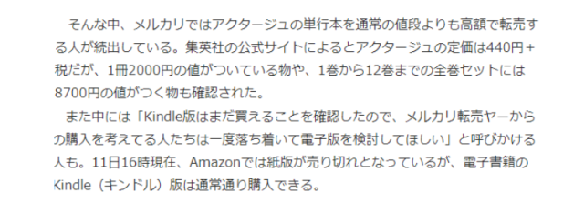 在確定絕版之後,目前日本實體書店面已經大多被搶購一空,並且從電商或代購的第一卷至包成套的12卷合購,顯然從市場原定價的初版440日元翻倍炒作,目前最高可以看到2100(日幣)的可怕行情,膨脹4.7倍。
