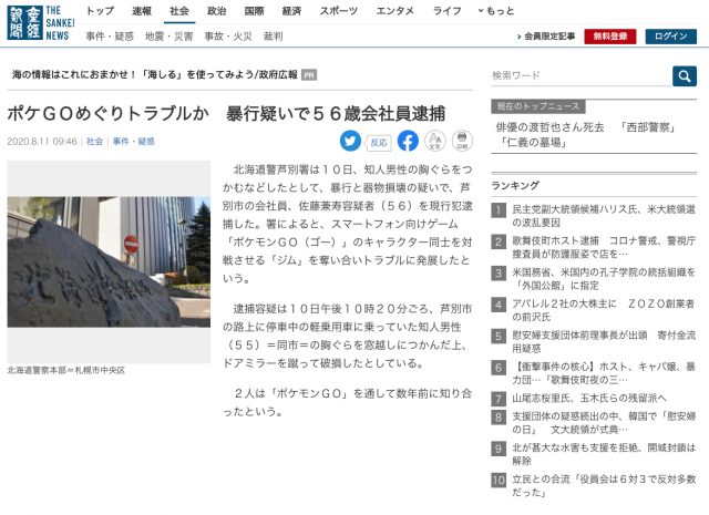 據新聞報導,56歲的佐藤兼寿嫌犯於蘆別市找到熟人,先是抓住胸部將他從車上曳出,過程扭打造成後視鏡毀損,最後警方以現行犯逮捕,確定爭執理由是手機遊戲《寶可夢GO》上的道館爭執。