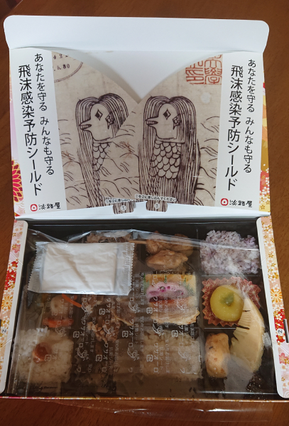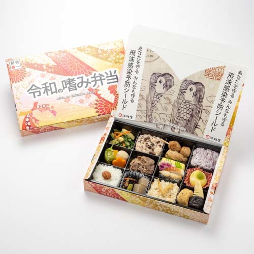 而這些飲食上的防疫措施也被沿用到便當上了,位於日本神戶的知名鐵道便當「淡路屋」為了因應肺炎疫情而特別製作了一款「隔離便當」,並將它命名為「令和年的美味便當(令和の嗜み弁当)」,可以看到紙盒裝的便當上蓋比一般便當高出一截,來阻擋用餐者之間的飛沫傳遞。