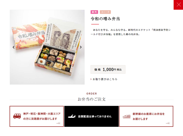 淡路屋的「防疫便當」,除了在新神戶站、神戶站與西明石站等定點能夠買到外,也能透過官網上訂購,在家也能吃到美味便當,定價方面為 1000 日圓。