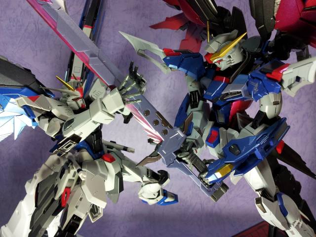 這是模仿SEED第一季的最後一撃,「製作」一個戰損版。當時FREEDOM沒了手腳頭,一劍KO天意高達。拆頭不難,但拆手腳有難度,所以只好利用拍攝角度,看下去似是「戰損」吧。