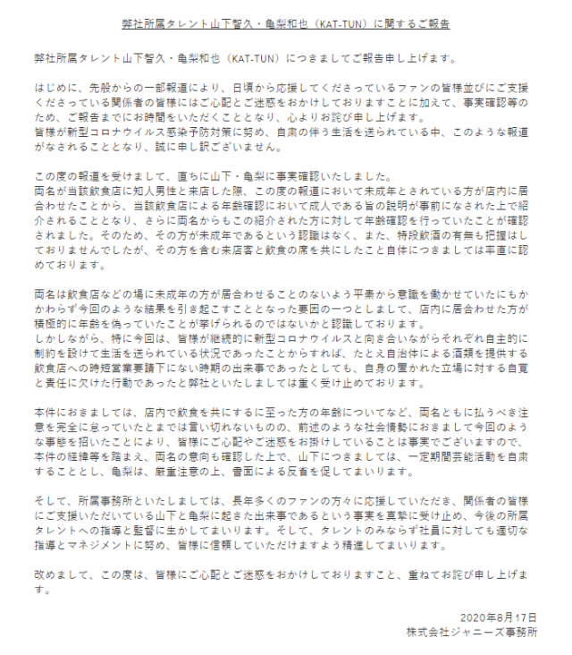 根據消息指出,傑尼斯事務所終於在今日於官方網站上公布了有關於山下智久的懲處事宜,提到了儘管當時少女確實向山下智久與龜梨和也謊報年齡,但由於兩位也依然在疫情期間爆發此事,為此便決定將暫時停止山下智久目前所有演藝活動,至於與他同行的龜梨和也則是需寫出書面悔過書。