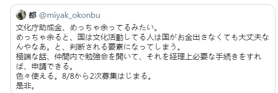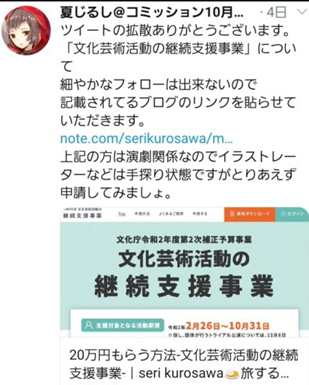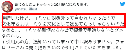 目前有許多創作者生活陷入困境,延伸出想申請輔助遭拒情況,得知政府單位還有紓困盈餘,但@natsu_illust 同人作者上網發文揭示,曾親自洽詢,日本政府回應:文化廳不承認CM是種文化,不在補助範圍內。