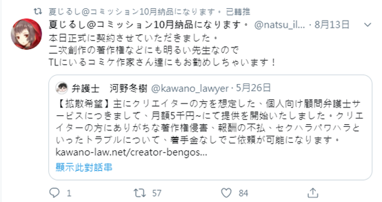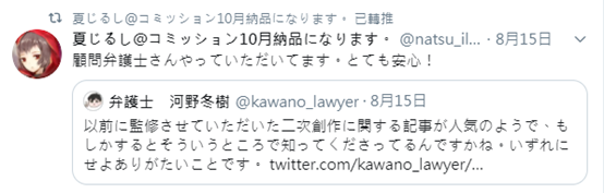 原PO在自己推特上經常分享自己同人營運的委託律師,負責處理版權問題與法律諮詢,同時也有大型社團開始自主性發起眾籌活動,為了度過眼前的創作難關,展示同人秩序在無政府狀態下的積極自救。