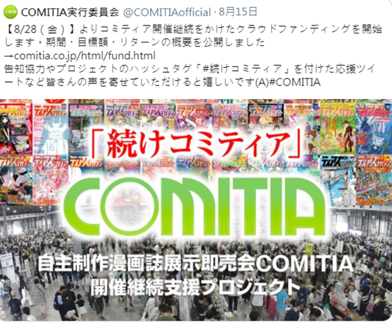 Comic Market近年來參加人數不斷增加,每次舉辦當日均會達到550,000人次以上,但日本因近期加劇關係被迫停辦,而八月的令和第二次「20萬文化藝術活動紓困」,政府因為不承認同人場文化為「文化」,造成話題炎上。