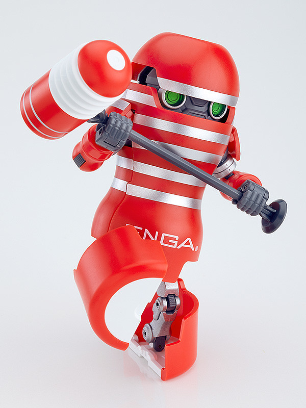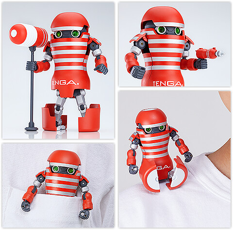 TENGA 機器人以真正 TENGA 的 1/2 大小(約 8 公分)呈現,有著俐落的機體曲線與銀紅相間的經典條紋塗裝,從 TENGA 形態完全變身為機器人形態後,伸出可愛的手手和藏在內部的綠色機械眼,稍顯笨重的大腳造型讓整體帶有微微蠢萌感,與「在關鍵時刻總會失誤」的角色設定呼應。內容一樣包含有敲一下便能充滿勇氣的「紅鎚子」與「TENGA光束槍」,讓玩具人除了能賞玩各種細緻的變形機關,還能放在口袋隨身攜帶、隨時戰鬥!!