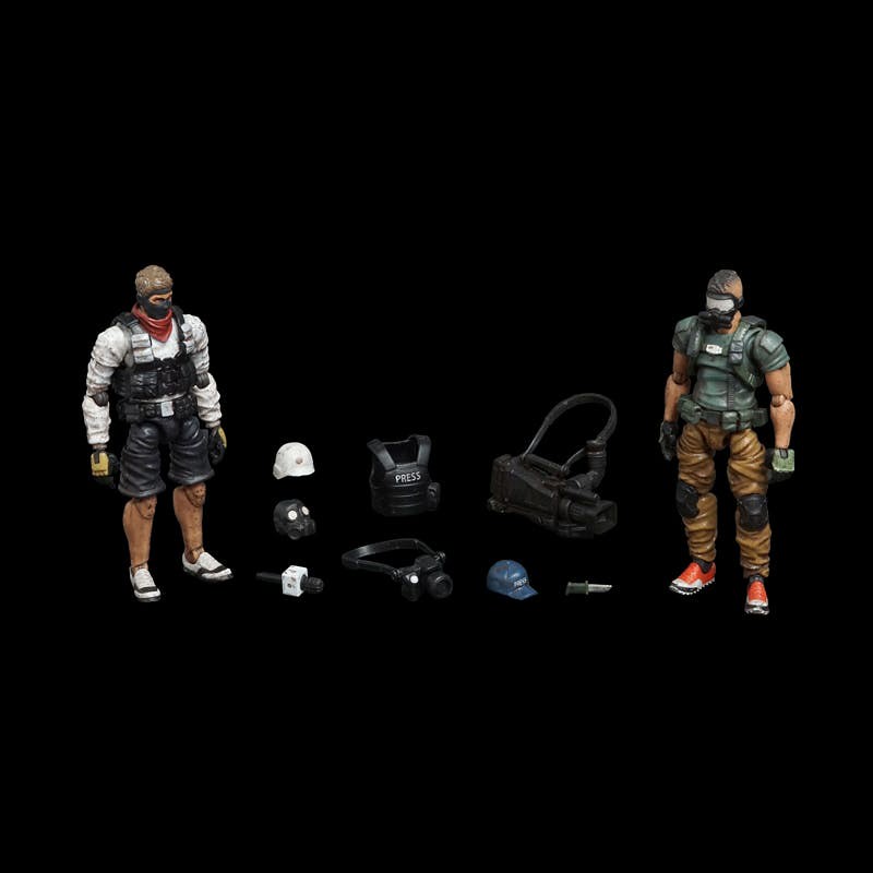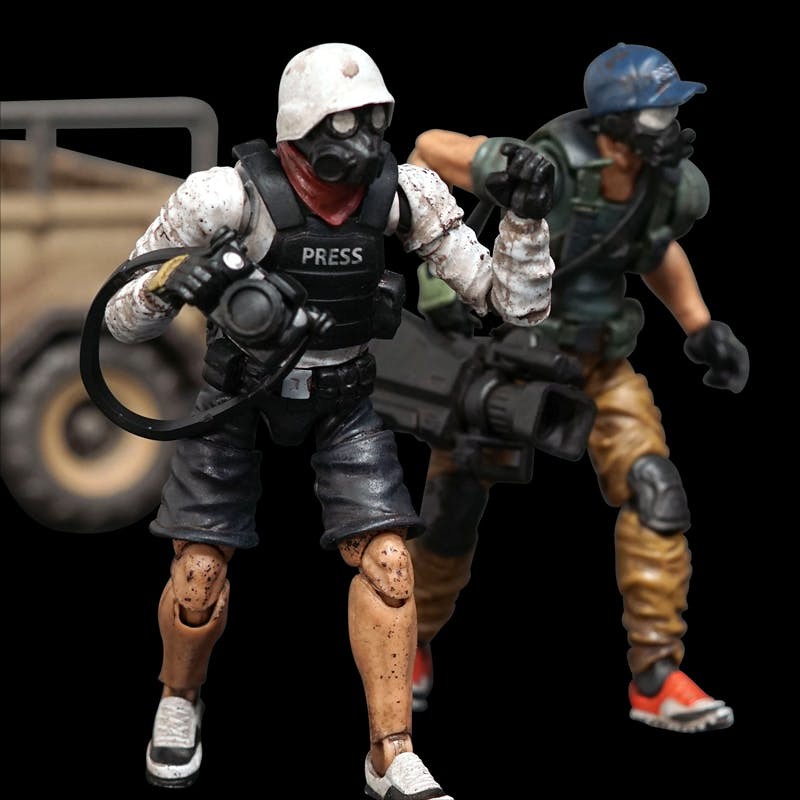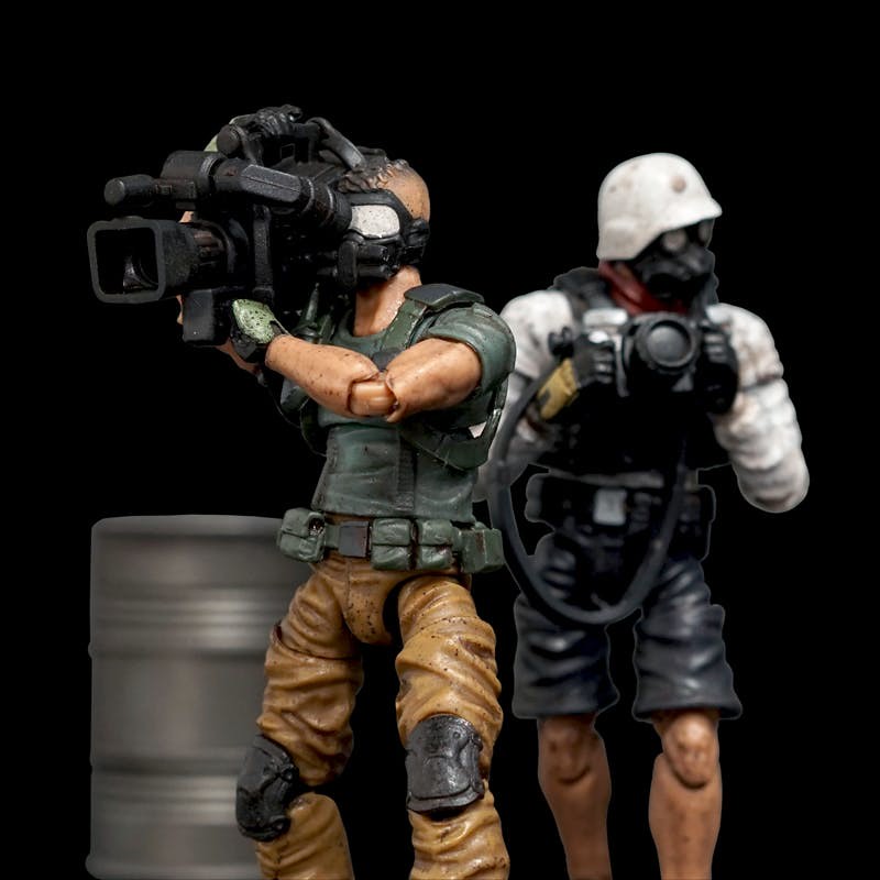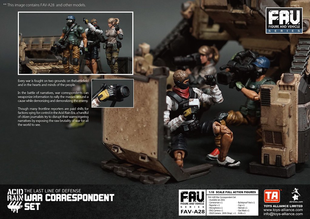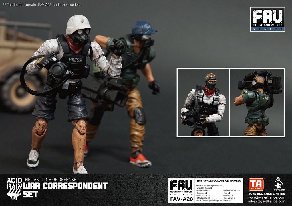 這次《酸雨戰爭》要帶來的不是新兵種或新載具,而是在戰場上一次又一次點亮閃光燈的戰地記者。即便有著選邊站、為不同勢力搶奪話語霸權的記者,仍有試圖揭露戰爭殘酷真相、客觀傳遞戰況的記者們存在;在「FAV-A28 戰地記者套裝」裡包含了攝影師&記者的雙人組合,還有麥克風、ENG 攝影機、連背帶的單眼相機這些報導配備,當然,在戰場上可說是必備的防彈背心、防毒面具、頭盔也都有附上,還有匕首、鴨舌帽。