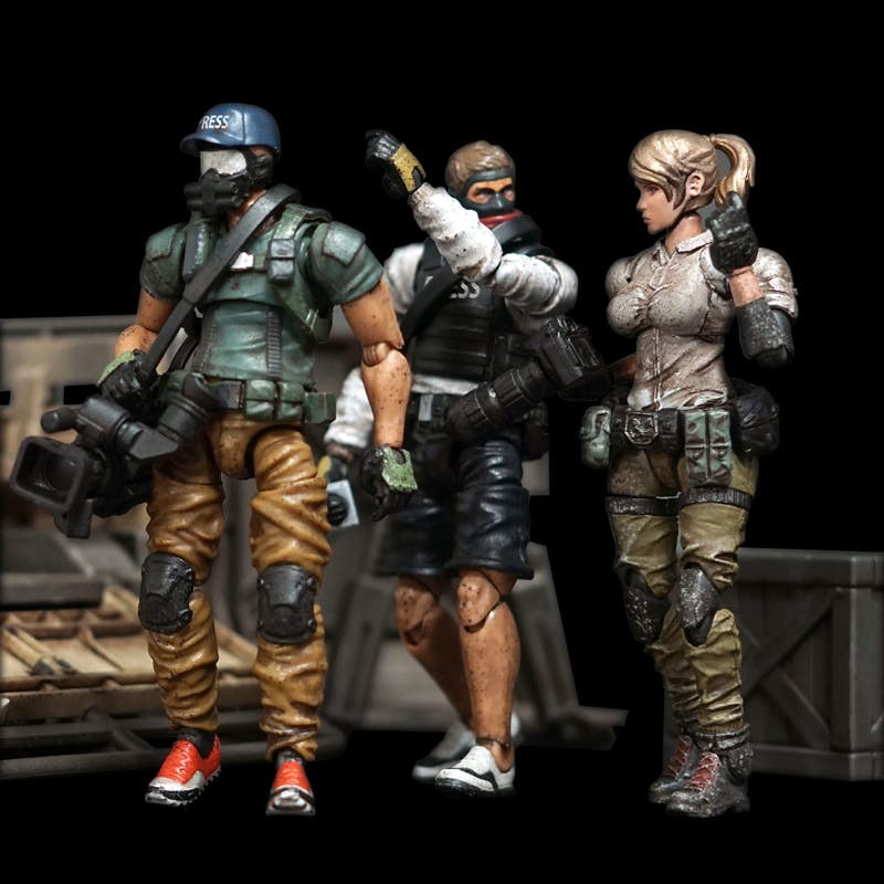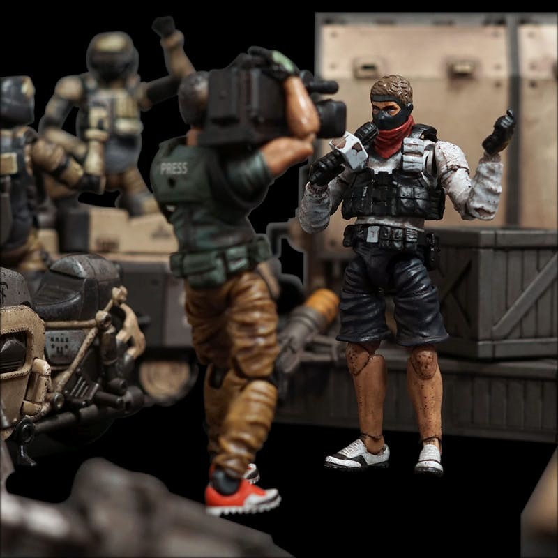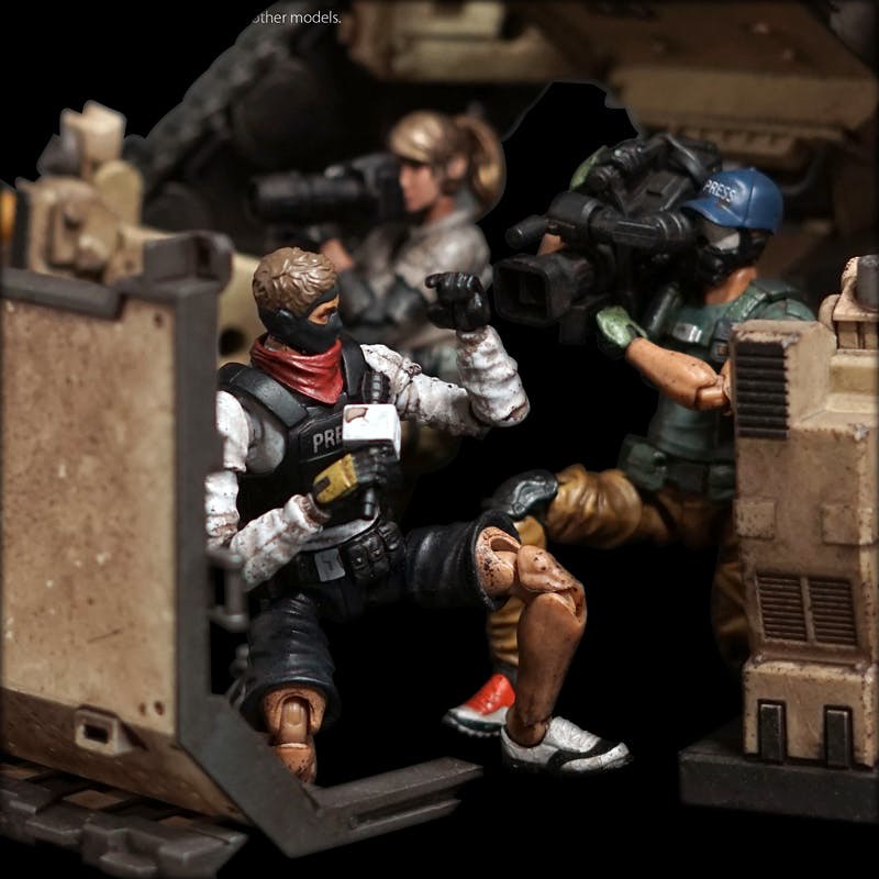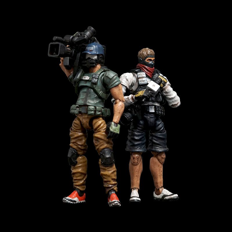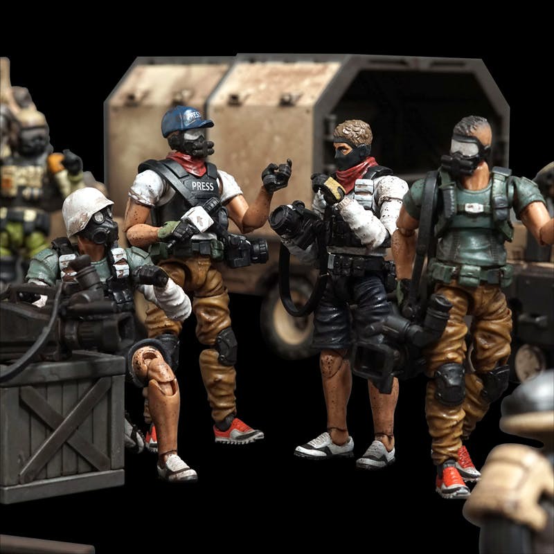 這次《酸雨戰爭》要帶來的不是新兵種或新載具,而是在戰場上一次又一次點亮閃光燈的戰地記者。即便有著選邊站、為不同勢力搶奪話語霸權的記者,仍有試圖揭露戰爭殘酷真相、客觀傳遞戰況的記者們存在;在「FAV-A28 戰地記者套裝」裡包含了攝影師&記者的雙人組合,還有麥克風、ENG 攝影機、連背帶的單眼相機這些報導配備,當然,在戰場上可說是必備的防彈背心、防毒面具、頭盔也都有附上,還有匕首、鴨舌帽。
