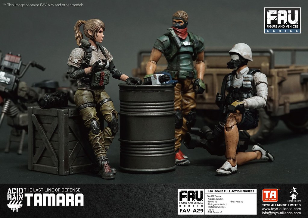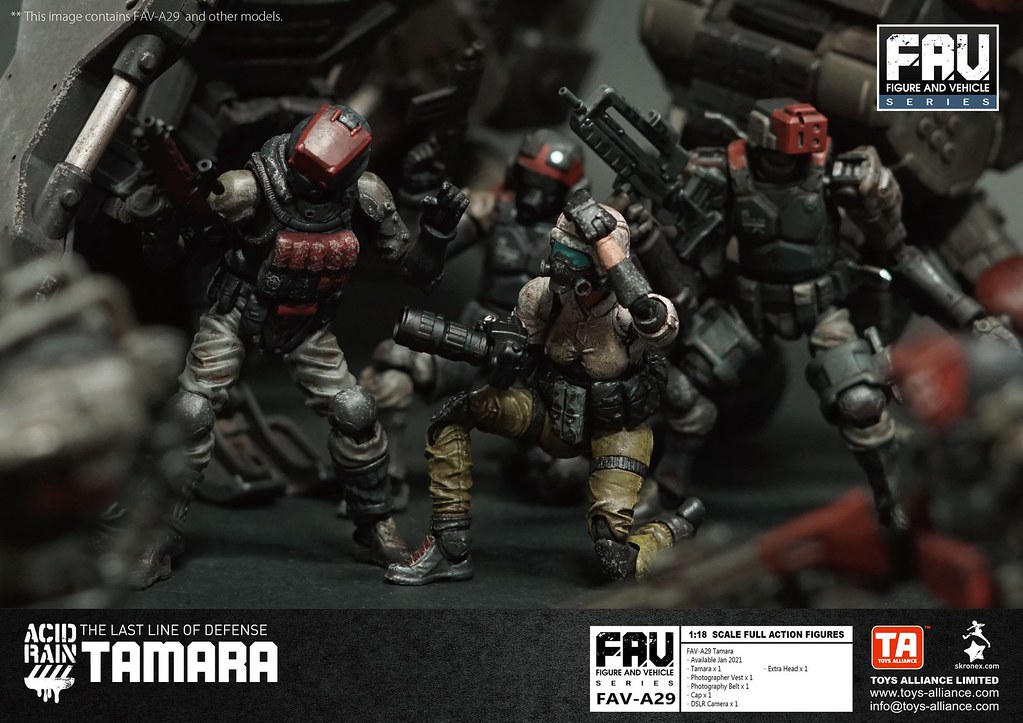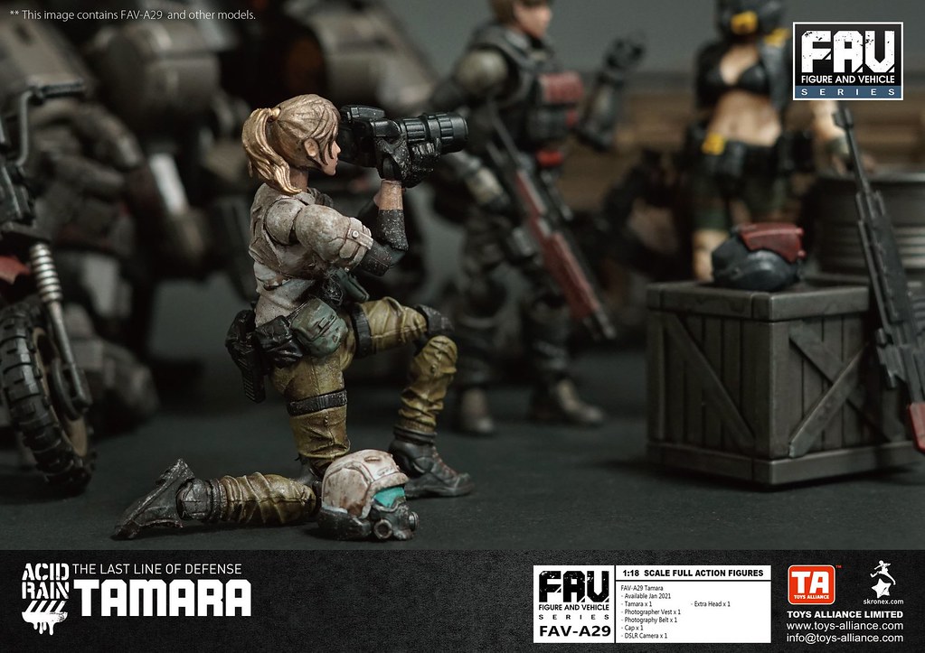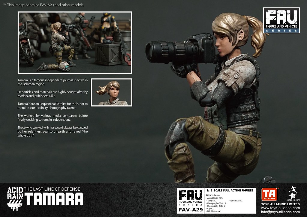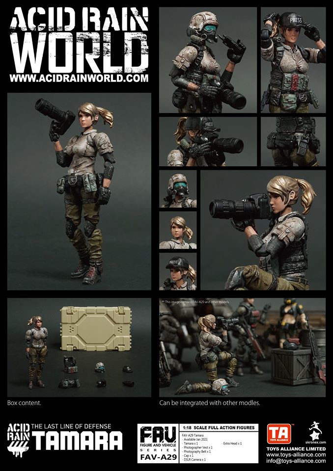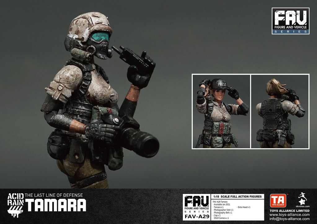 知名 3.75 吋科幻軍武主題收藏系列《酸雨戰爭》日前發表了多款新作,本篇將帶來「FAV-A28 戰地記者套裝」(War Correspondent Set)與「FAV-A29 塔瑪拉」(Tamara)兩款 1/18 比例可動人偶!皆為 2021 年 1 月發貨。
