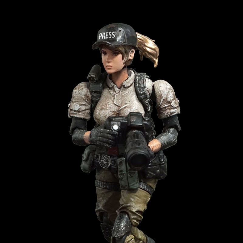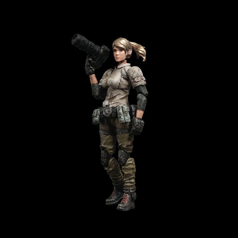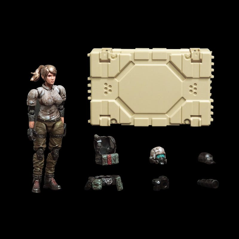 再來是影像表達能力出色的獨立女記者「塔瑪拉」,有著追根究底的執著與決心,現活躍於拜洛瑞亞(Belorean )地區;本作除了塔瑪拉本體之外,還包含了背心與腰帶、一台單眼相機、印有 PRESS 字樣的黑色鴨舌帽,以及一個戴著頭盔的替換頭雕,位於肩膀的可動關節可輕鬆擺出拿持相機、戴上帽子,與其它幅度較大的動作。