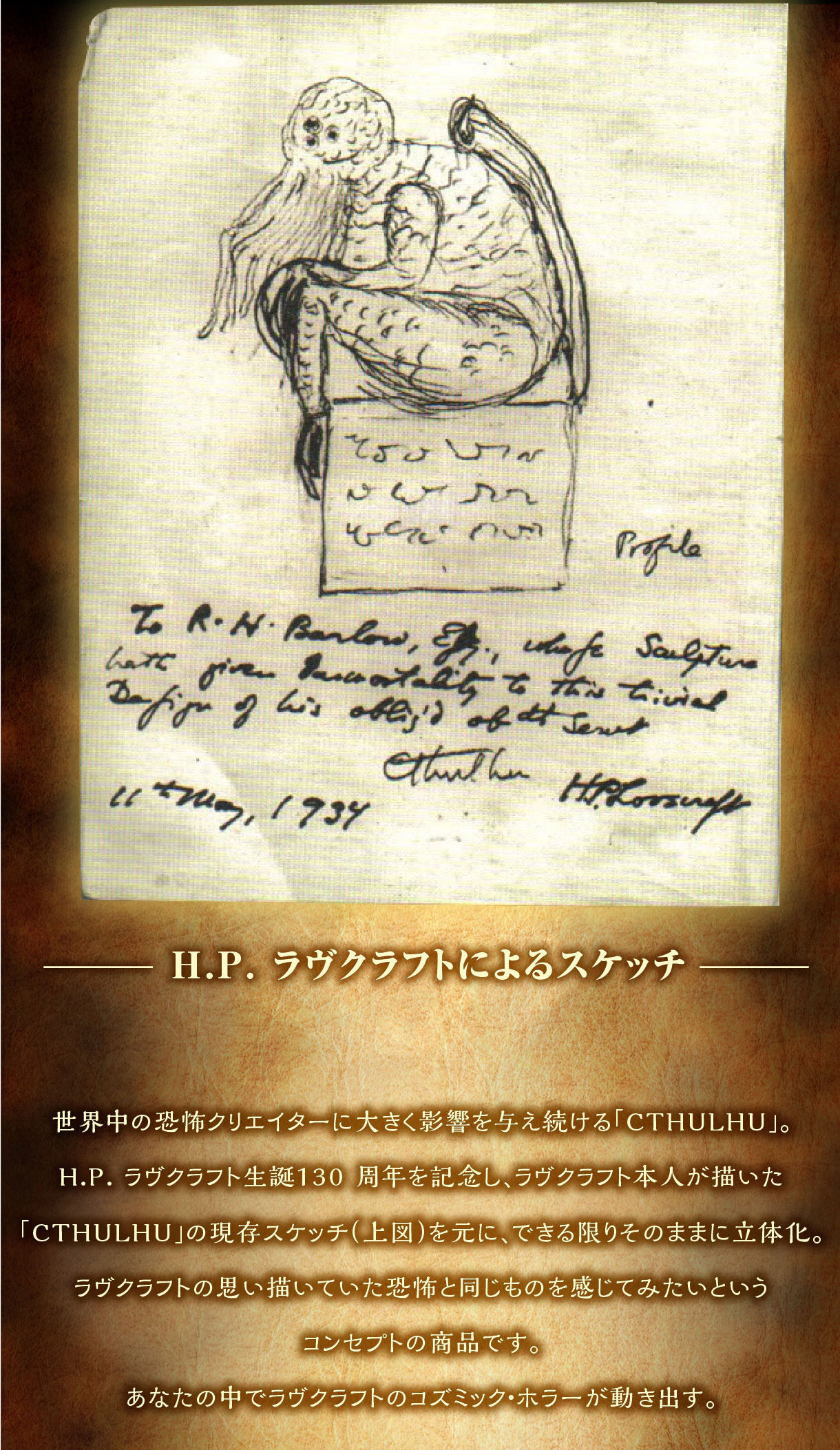 「H·P·洛夫克拉夫特 克蘇魯 CTHULHU」塗裝完成品,根據 H.P.洛夫克拉夫特本人所繪畫的「CTHULHU」素描設計,將章魚般的臉部、巨大鉤爪、背部長著蝙蝠般細長翅膀等特徵立體化,並用暗紫綠色的塗裝呈現出克蘇魯黑暗、恐怖的印象。除了縮起身體的詭異姿勢,還附有可以替換用的左右臂與左右腳,能夠展現出克蘇魯張狂的站立姿態!讓我們再次進入H.P.洛夫克拉夫特的恐怖世界......