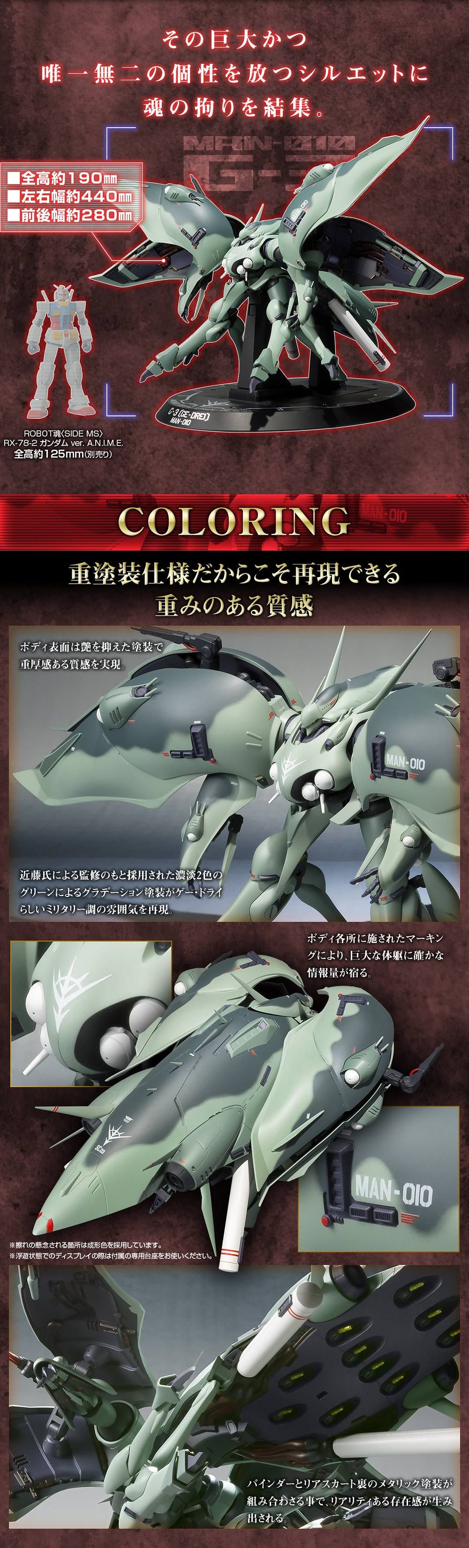 武裝部份也還原了全身多處的球狀光束砲、雙肩光束砲、藏於肩甲內側的四把光束軍刀、光束軍刀特效、後裙甲內可拆卸的 10 枚感應砲、機身後方掛載的兩組燃料槽。全機擁有多處可動關節,部份關節更採用合金零件提高強度,得以再現 G-3 的變形機構。專用底座除印有吉翁國徽、機體型號外,支架還能夠調整 3 種高度變化,可搭配不同的姿勢、型態使用。
