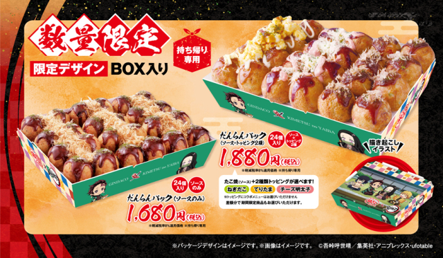 《築地銀章魚燒》 在日本經營近30年的章魚燒品牌,也是許多人前往日本時非常容易見到的連鎖章魚燒店鋪。這次合作中會依照日期推出三彈的章魚燒組合,分別為三位角色: 竈門炭治郎-燒風雞絞肉章魚燒 、竈門禰豆子-起司明太子章魚燒 、「炎柱」煉獄杏寿郎-辣味洋蔥章魚燒。分別以角色盒裝包裝,在各別時間限定發售。每購買一盒限定章魚燒還可以獲得《鬼滅之刃》 的原創卡片,讓粉絲能夠收集。