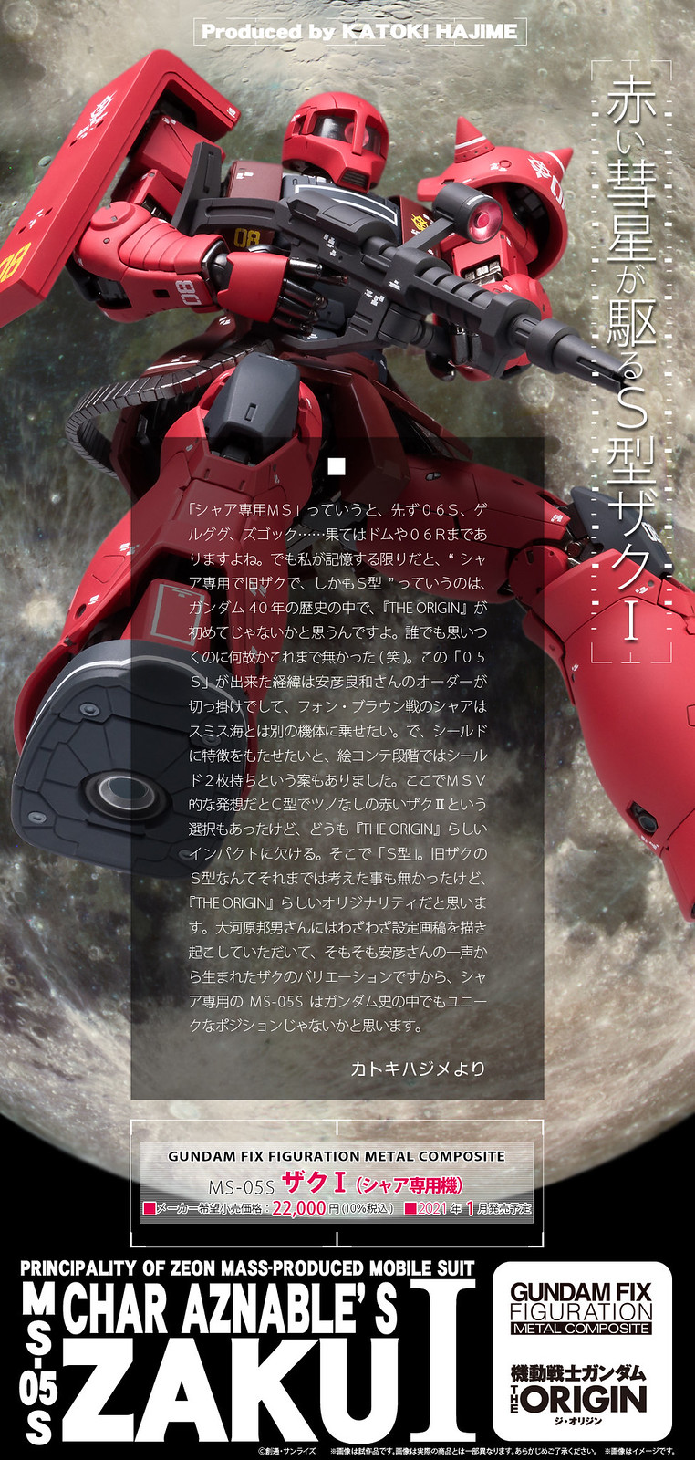 由日本BANDAI SPIRITS 公司收藏玩具事業部 TAMASHII NATIONS 推出,人氣機械設計師 Katoki Hajime 監修的合金、ABS 完成品系列『GUNDAM FIX FIGURATION METAL COMPOSITE』繼 MS-06S 夏亞專用薩克II後,再度發表出自《機動戰士鋼彈 THE ORIGIN》的最新商品「MS-05S 薩克I(夏亞專用機)」預計於 2021 年 01 月發售的消息。