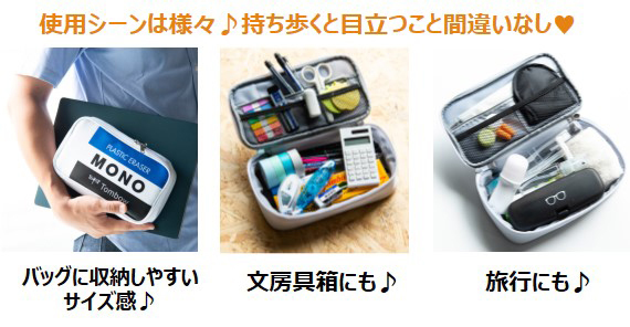 這其實是寶島社過去發行過不少次的「人氣文具付錄」系列書刊,推出不少文具品牌相關的刊物。這次以「 蜻蜓牌MONO橡皮擦」 的外型設計為隨行包,可以輕鬆收納辦公所需的小工具,如;滑鼠和充電線;用於旅行做簡便的收納也不是問題,充當女生的化妝包也非常適合。