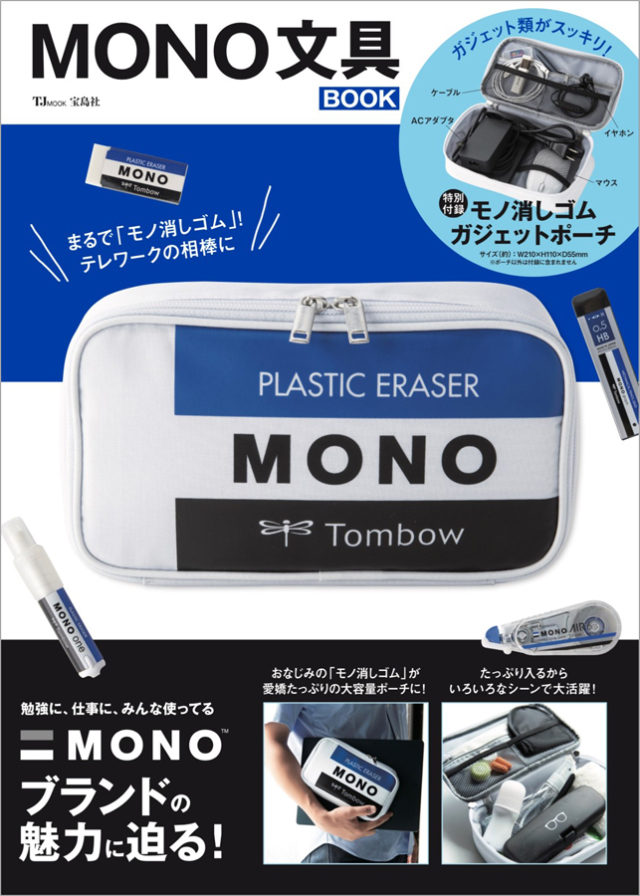 這款外型簡約,蜻蜓牌旗下最為人稱道的橡皮擦,一眼就能從成堆的文具中被認出,擁有如此高度熟悉的招牌視覺。近日日本寶島社推出了「MONO文具BOOK」,最吸引人的就是附錄贈送的「 MONO橡皮擦隨行包」,單本售價1,890 日圓,預計 2020 年 8 月 31 日發售。