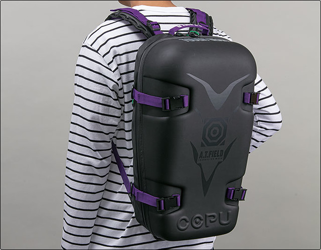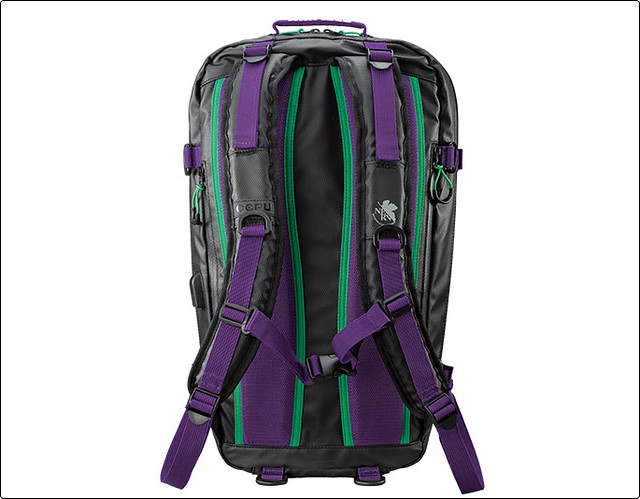 包包的側面配置有 USB 插孔,可以直接將手機和外接行動電源連結,側邊的一部分有反光條,保持在黑暗中的安全性。而在整體的視覺上,除了採用和初號機相同的紫、綠、黑等基本配色之外,在外殼上也印有「A.T.FIELD」和「NERV」等字樣,讓 EVA 的元素感滿溢其中,是 EVA 迷們會想要收藏的一款好物。