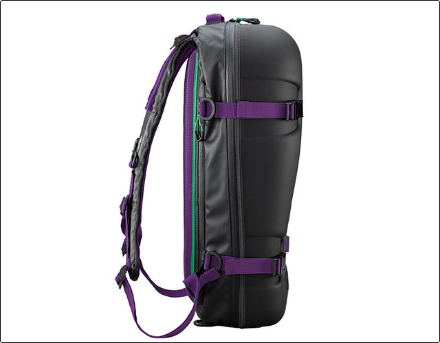 這款看起來相當大咖的 EVA 後背包,從外觀就可以感受到它對衝擊的保護有一定程度,主要以名為「EVA 材質」的柔軟抗撞材質,做為背包大部分面積的外殼,具有防撞的功效時也兼具一定的防潑水功能。包包的開啟口是從中間的拉鍊,將背包猶似一切分開各半的感覺展開,內部收納分為兩部分,一邊是可以放入 13 吋筆電和各種小物的多功能層隔袋,另一邊則是可以放置衣物等物品,類似行李箱的空間。
