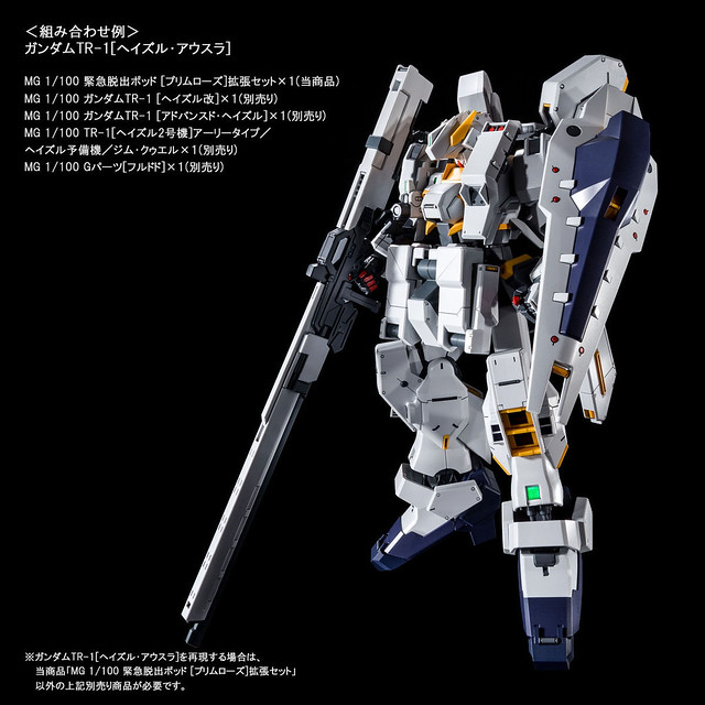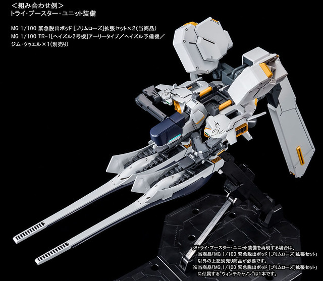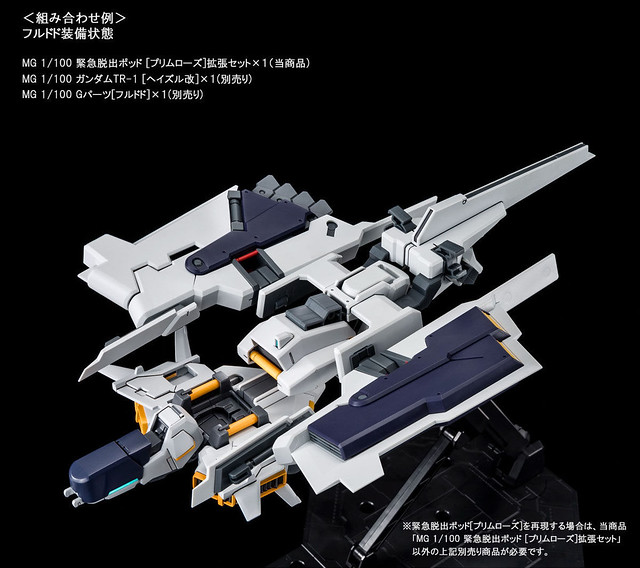 此外 PREMIUM BANDAI 也有單獨販售MG 1/100 緊急逃生艙 [PRIMROSE]擴充組,內附與海茲爾.奧斯拉相同的展示台座與水貼紙,能與另售的 MG 1/100 鋼彈TR-1[海茲爾]系列機、弗多德等套件搭配使用。