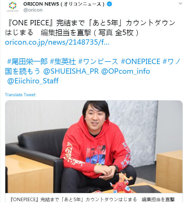 在去年時尾田老師有在日本知名YouTuber的Fischer's頻道中說過《ONE PIECE》的漫畫大概在 5 年就會完結,同時《週刊少年Jump》編輯部也證實這個消息。