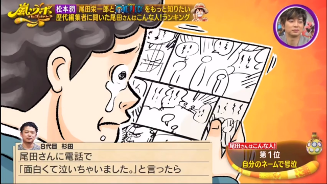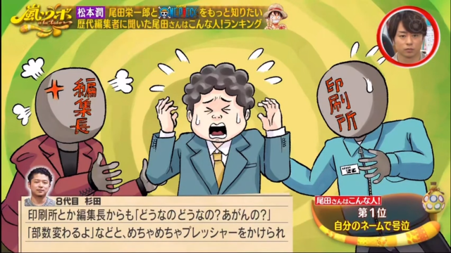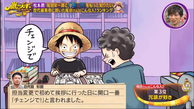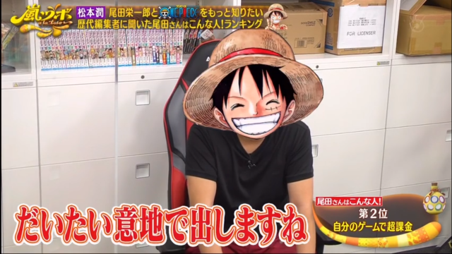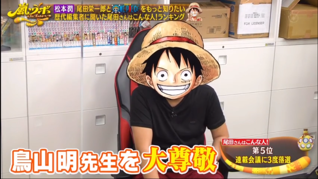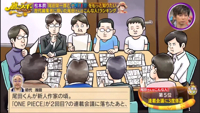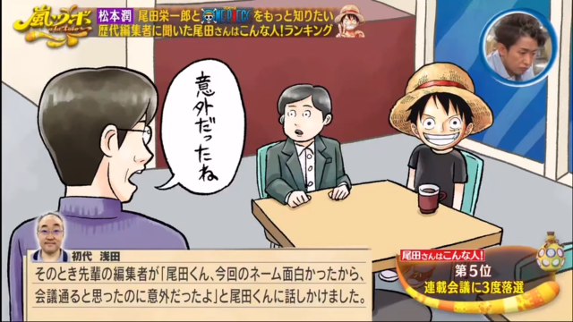 嵐也在節目中問到為何當時落選了三次連載會議,卻還不打算轉到其他雜誌,像是《週刊少年Magazine》或是《週刊少年Sunday》上面連載呢。尾田則回答因為他非常尊敬《七龍珠》的作者鳥山明,希望可以在跟他同一本雜誌上連載,才會堅持不轉到其他雜誌,留在《週刊少年Jump》繼續奮鬥,而最後我們看到的成果就是如此的成功,或許當初尾田的這個決定也是好的呢。