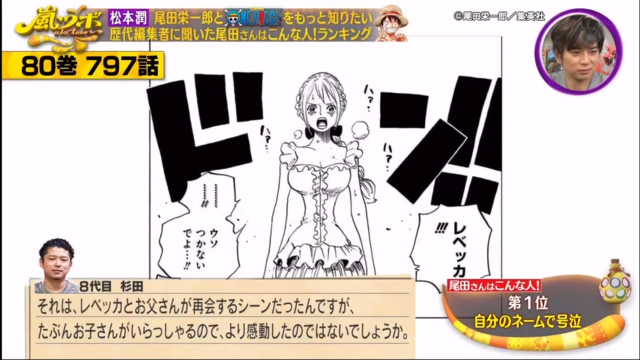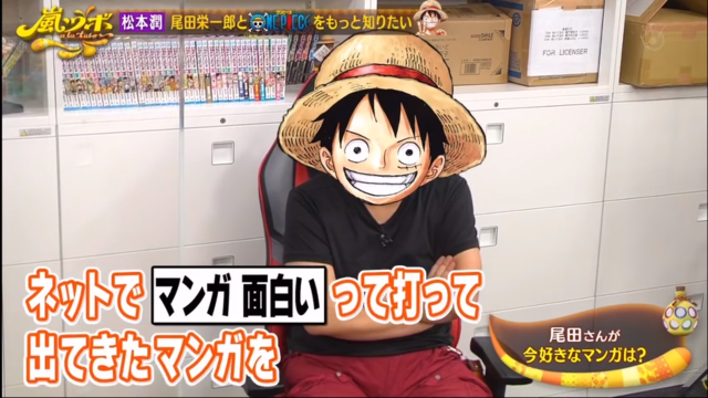 嵐也在這時問了尾田老師有沒有喜歡的漫畫呢,然而尾田老師可能是因為沒多餘時間也沒什麼概念,都是直接上網谷歌「漫畫 有趣」這些關鍵字來找尋現今有趣的漫畫有哪些,讓眾人不禁笑出來了,真的是太懶啦XD