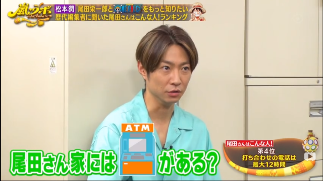 嵐的成員也問尾田一個問題,因為聽說他家非常大,所以很多網友都很好奇他家到底有沒有ATM,尾田當然回答「沒有」。