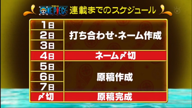 在這個特別合作的節目中也有提到尾田老師平時畫漫畫工作的時候,一週中每一天的行程表,第一天到第三天為打草稿、想劇情、和責編討論,第四天要完成草稿和分鏡,第五天到第七天要將原稿畫完、線跟網點上完、上完色,再來就是完成原稿並繳交出去給編集部。