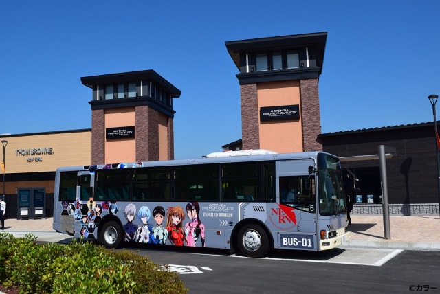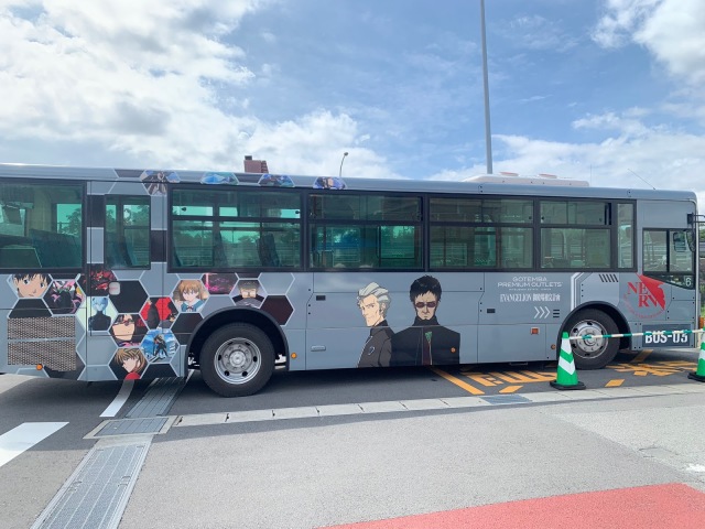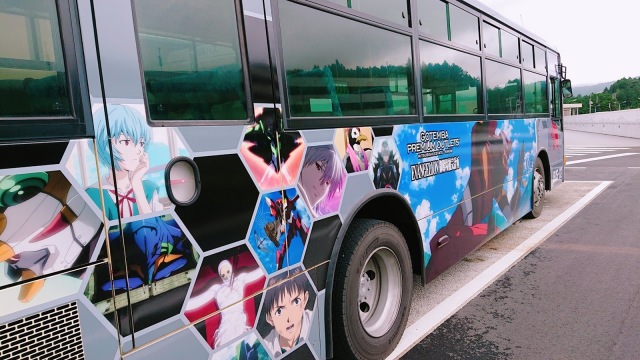 除了上述的場景擺設之外,往來 JR 御殿場站的免費接駁車也換上了EVA彩繪車,車內的廣播語音是由明日香、美里的聲優錄製,替遊客們報告相關活動資訊~