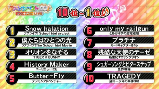 從2017年的排行觀之,不難發現當紅作品的力量,且以虛擬偶像IP為主的音樂渲染強大,當時的《LOVE-LIVE!》就占領了前兩名,而《殘酷天使》經過多年傳誦也在200名中得到第八位,真是萬年不朽。