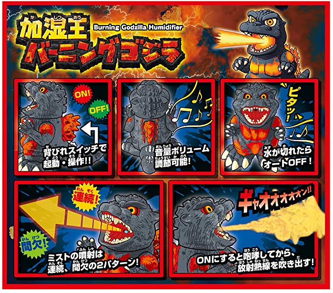 「加濕王 紅蓮哥吉拉」在張口咆嘯噴出煙霧加濕時,LED燈會亮起,並有哥吉拉的相關配樂,讓加濕變得相當有趣又熱血!可以透過背部得背鰭調整音量與「連續模式」或「間歇模式」兩種不同的加濕模式,當水不足時就會自動斷電,操作非常簡單。