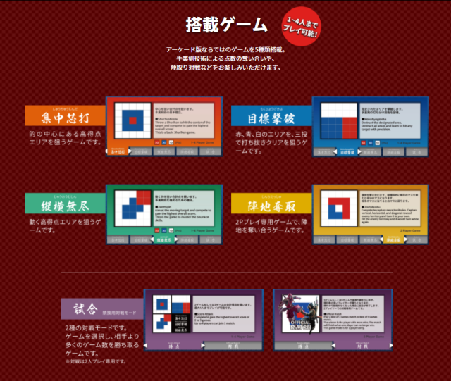 就如今年 2 月的JAEPO 2020所介紹,《NINJA TRAINER ARCADE》機台一共採五種遊戲模式,其遊玩人數最多可達到 4 人。而機台靶心的部分,也使用了容易插入手裏劍的特殊材質,讓初學者玩家也能容易上手。