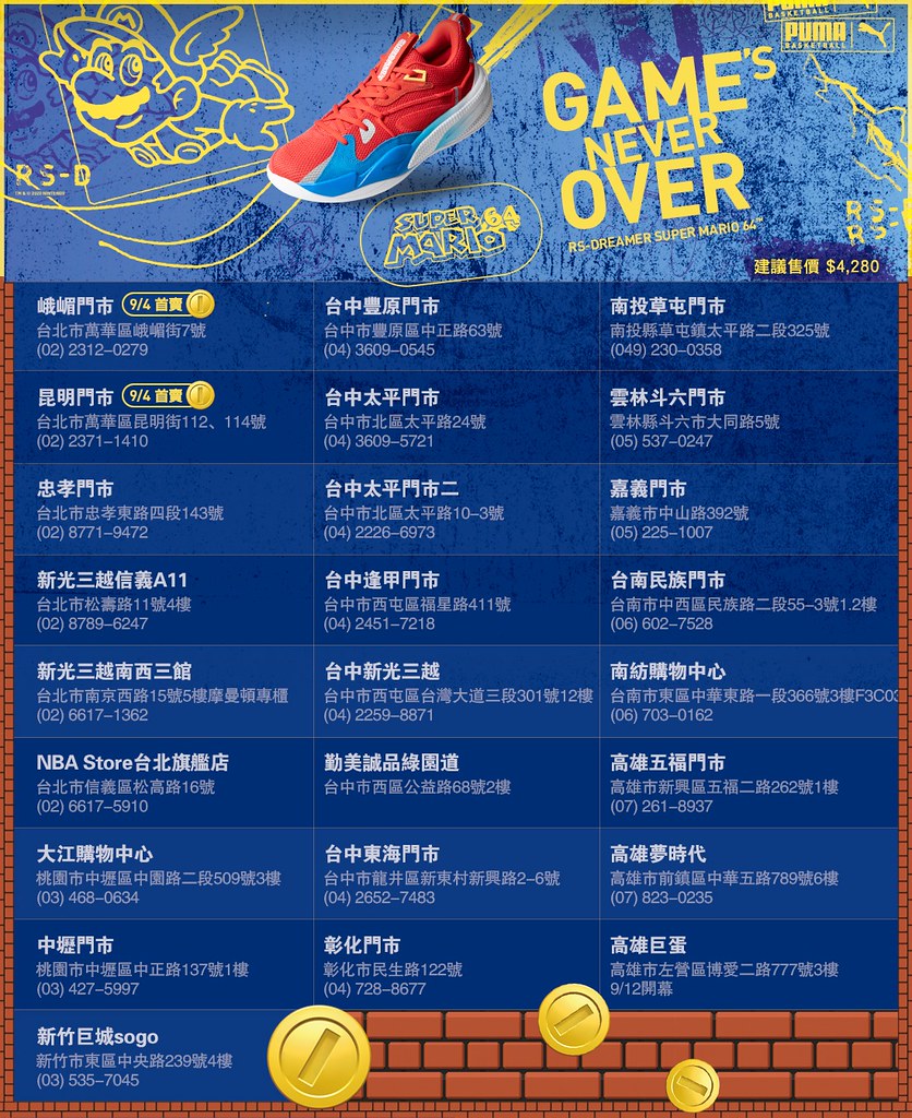 PUMA於今(4)日曝光了 PUMA Hoops 與經典電玩大廠 Nintendo任天堂合作的全球限量最新鞋款「PUMA RS-Dreamer Super Mario 64」籃球聯名鞋,慶祝《超級瑪利歐兄弟》35 周年!為迎接這雙聯名大作在台灣上市,PUMA 選在西門町峨嵋門市及昆明門市,於 9 月 4 日搶先首賣!並於 9 月 5 日起正式於 PUMA 指定門市販售,參考售價為 NT$4,280,瑪莉歐迷快去搶購一波吧!