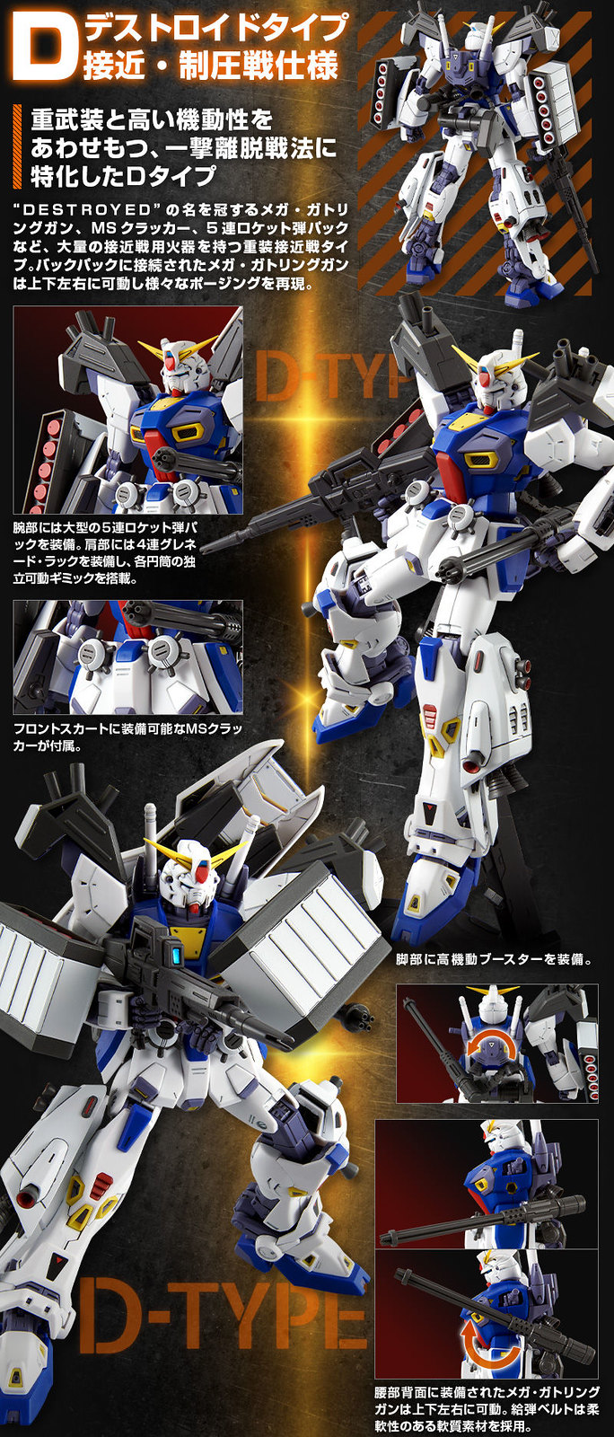 接近.壓制戰規格 D 型任務背包以新規零件再現 5 連火箭彈發射器/4連榴彈發射器/MS手榴彈/MEGA格林機槍以及雙腿兩側的高機動推進器。