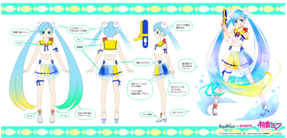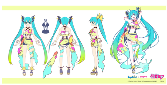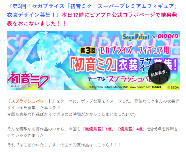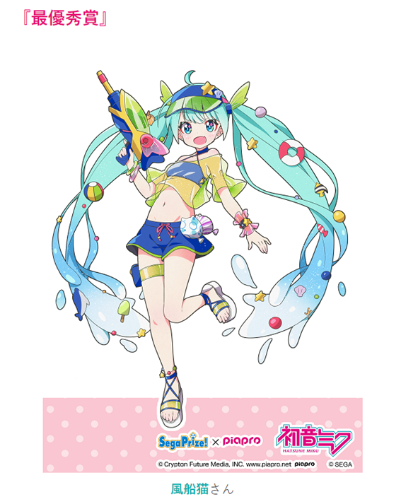 PIAPROクリプトン官方日前(3)報導最新消息,第三回SEGA「初音服裝設計大賽(スプラッシュパレード)引夏日色彩為題,並公開發表五位優秀作品,包含四位優選與一位「最優秀賞」殊榮,最大獎由台灣繪師風船猫老師與他的夥伴共同完成,且官方正著手「實體化景品」與壓克力吊飾等周邊發布,令人期待。