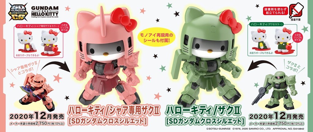 為慶祝人氣動畫《機動戰士鋼彈》40 周年與誕生 45周年的三麗鷗明星《HELLO KITTY》,雙方展開一系列「《機動戰士鋼彈》x HELLO KITTY」合作搶錢企劃,在先前推出「HELLO KITTY / RX-78-2 GUNDAM」的夢幻組合與眾多週邊商品後,這次日本公司 BANDAI SPIRITS 終於推出「HELLO KITTY /夏亞專用薩克II [SDCS] 」與「HELLO KITTY /薩克II[SDCS]」組裝模型啦!!參考售價為各日幣 2,750 元,預計 2020 年 12 月發售!