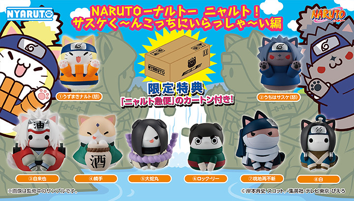 日本 Megahouse 玩具公司以《火影忍者》為主題推出超可愛的「喵影忍者-木業村的快樂貓咪們 篇」和增大340%的「大喵影忍者」後,這次全新一彈「喵影!佐助君過來這裡~篇」又將劇中的 8 位人氣角色變身成貓咪啦!一組參考售價為日幣5,720円,預計於2021年2月下旬發貨。