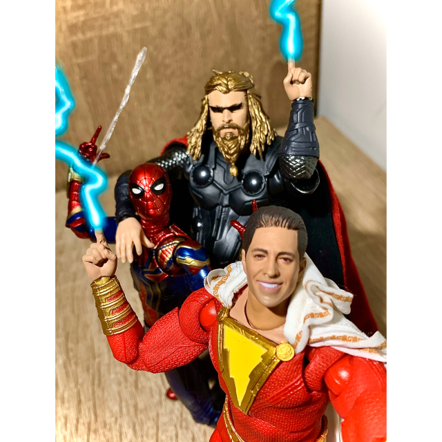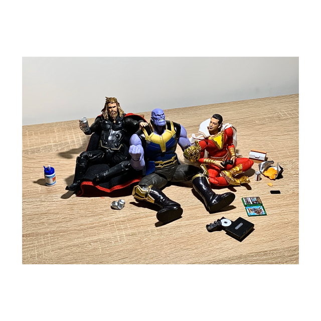 這次使用mafex的沙贊跟shf 的復4索爾,擁有高可動和豐富表情與配件的沙贊能擺出各種俏皮風趣的動作,完美的表現出一個屁孩「能力越大,玩得越嗨」的精神;可動不差、配件簡單的索爾 ,加上墨鏡與啤酒再配上放空的表情 ,完整詮釋出宿醉放飛自我的”strongest avenger “!!