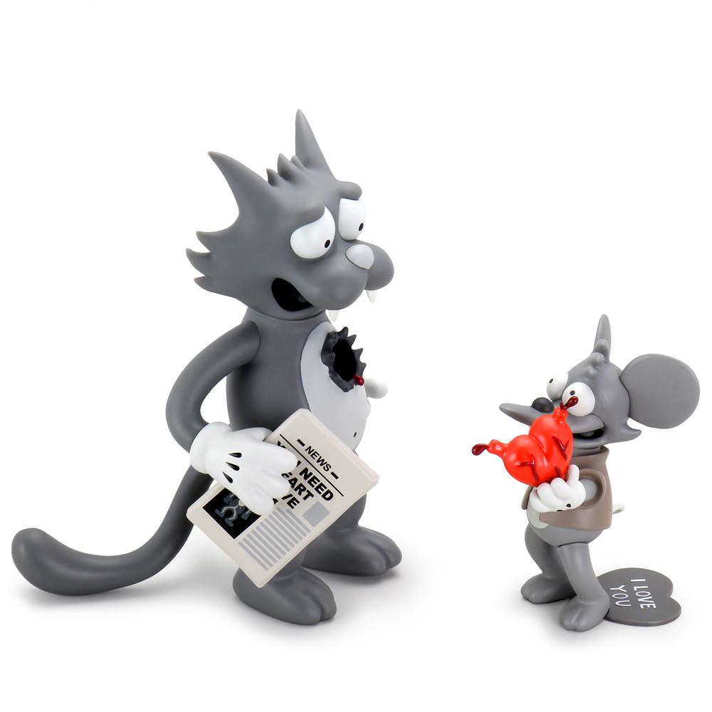 《The Itchy & Scratchy Show(躺姆貓與揭力鼠)》是《辛普森家庭》裡惡搞《湯姆貓與傑利鼠》的動畫,極為血腥暴力,躺姆貓幾乎每次都會慘死在揭力鼠刀下....不,應該說是死於各種誇張的兇殘手段之下!本次的人偶套裝是以 My Bloody Valentine 這集為題設計,再現了被掏心之後的躺姆貓跟壞到不行的揭力鼠,躺姆貓的心臟與那份「你需要心臟才能活」的報紙皆為獨立零件,揭力鼠腳下的則是躺姆貓送他的 I love you 愛心,超級諷刺。