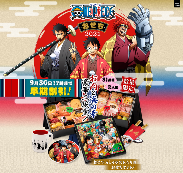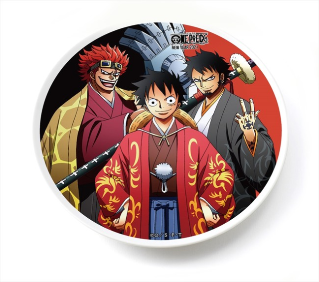 今年與《ONE PIECE 航海王》合作特殊日式年菜已經是第 5 年,每年更換的插圖和附贈品也是一個讓人非常期待的樂趣之一。目前的 2021 年版本附贈的東西有印著穿著和服的草帽小子一夥的便當盒、印有穿著和服的三位船長的陶瓷盤、刻著喬巴台詞的木筷、印著草帽海賊團九人舉起手背對著的樣式的馬克杯。
