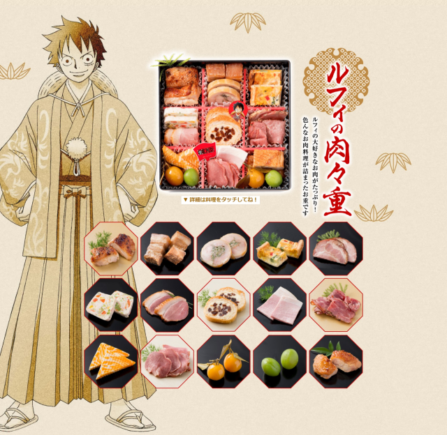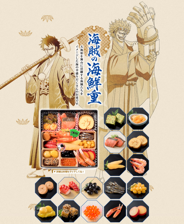 這次的御節料理(日式年菜)總共分為兩種,分別為「海賊的海鮮年菜」、「魯夫的肉肉年菜」這兩種(全 31 款年菜)。這其中不用說年菜內的基本食材,還會由擁有 100 多年歷史的老字號廠商來監督,絕對讓大人、小孩、老人,都吃得滿意。
