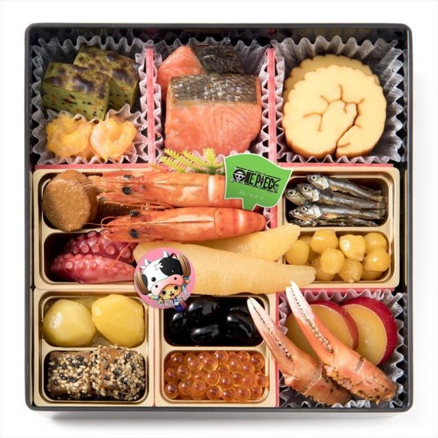 這道年菜是以精挑細選的海鮮來塞滿整個便當盒,除了蝦仁、鯡魚子、鮭魚卵、章魚腳這些有著慶祝正月喜慶的海鮮外,還有加入伊達卷、栗金糖、黑豆這些年菜中不可缺少的基本料理。在裡面也夾了兩張有著喬巴和「ONE PIECE」LOGO的小紙張。