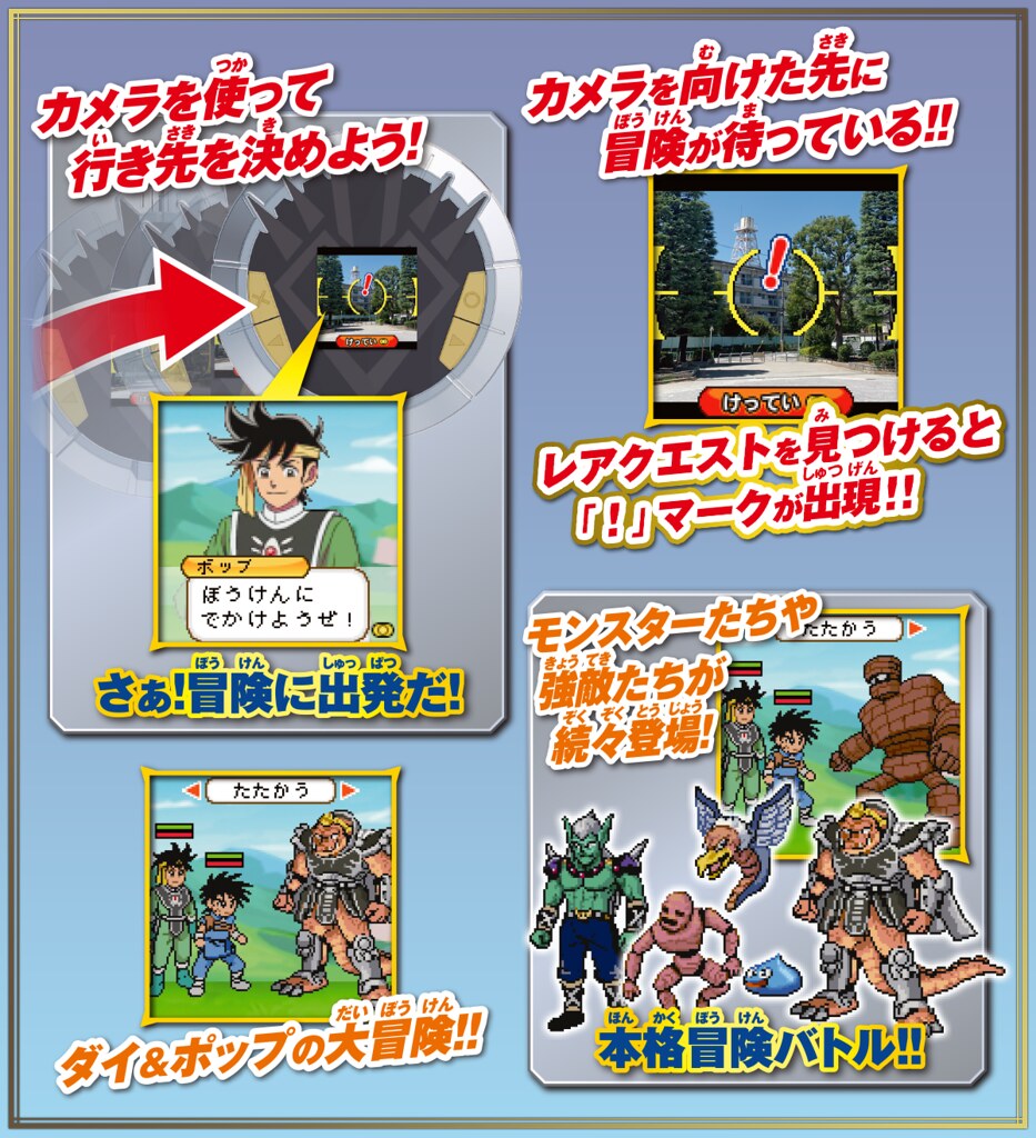 「勇者鬥惡龍 達伊的大冒險 Portable Adventure」以電視動畫版《勇者鬥惡龍 達伊的大冒險》的世界觀再現冒險內容,擁有易於攜帶的直徑 7.8 公分小尺寸,搭載 1.44 吋全彩液晶螢幕、攝影機與加速規。啟動遊戲後能夠結合現實世界的景物觸發任務,展開冒險!