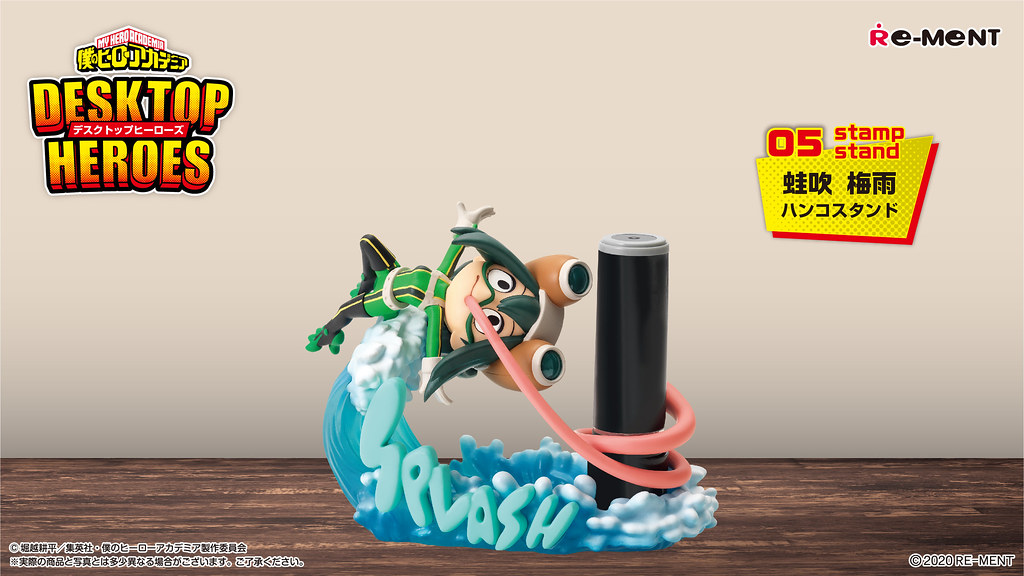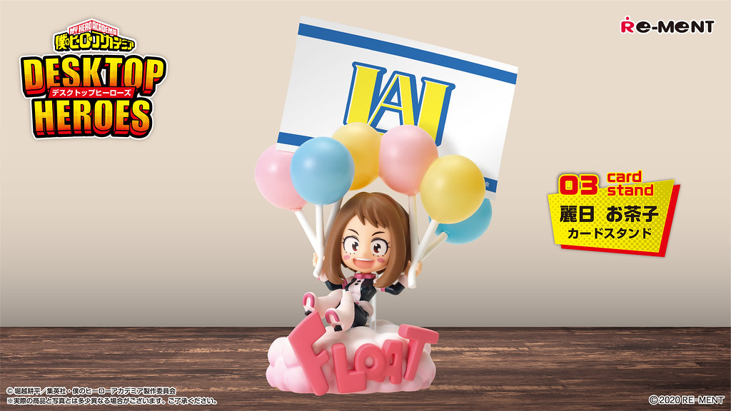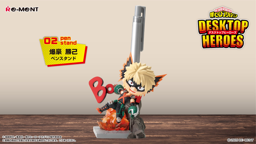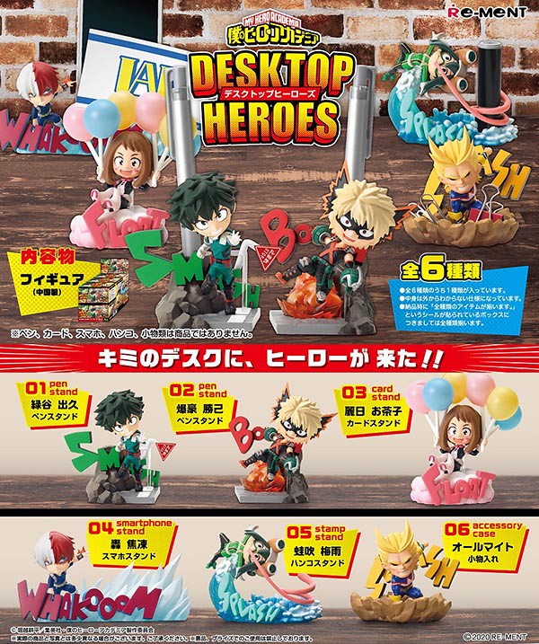 「我的英雄學院 DESKTOP HEROES」盒玩,將六款角色設計成實用又可愛的桌上小物,陣容包含:綠谷出久筆架、爆豪勝己筆架、麗日御茶子名片架、轟焦凍手機架、蛙吹梅雨印鑑架以及歐爾麥特小物收納盤。華麗的特效和招式的英文特效字,小小的場景設計也相當精緻,將各角色的特色嶄露!放在桌上相當可愛趣味~