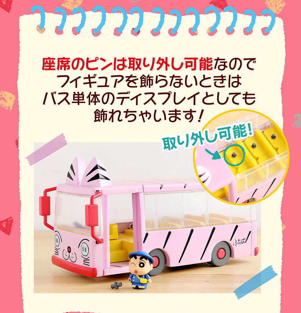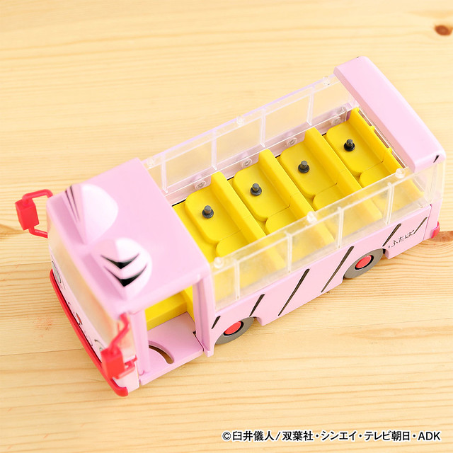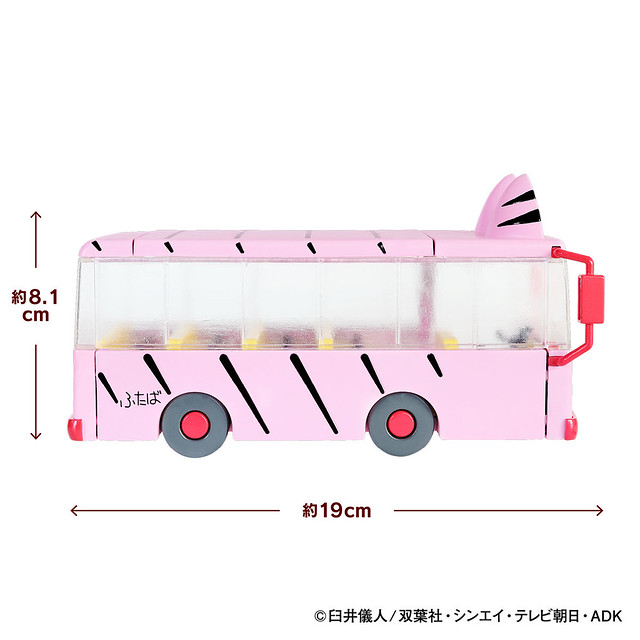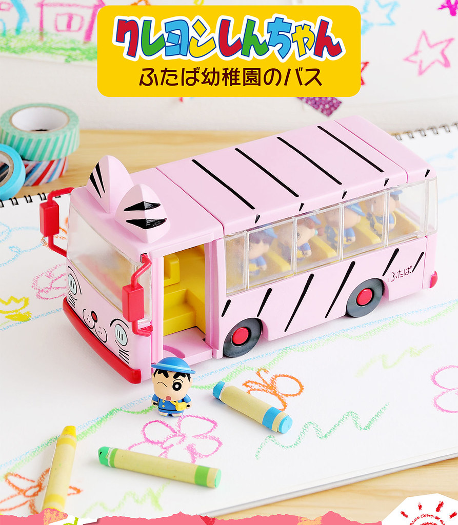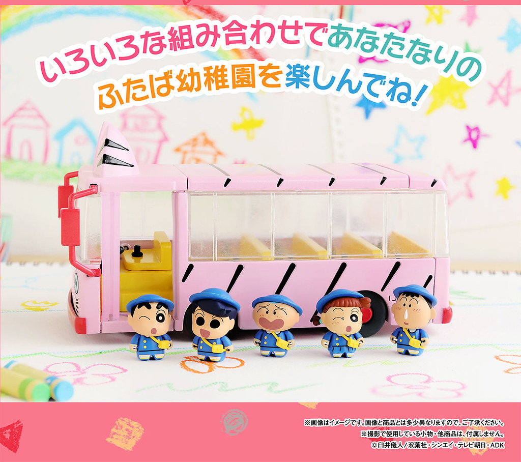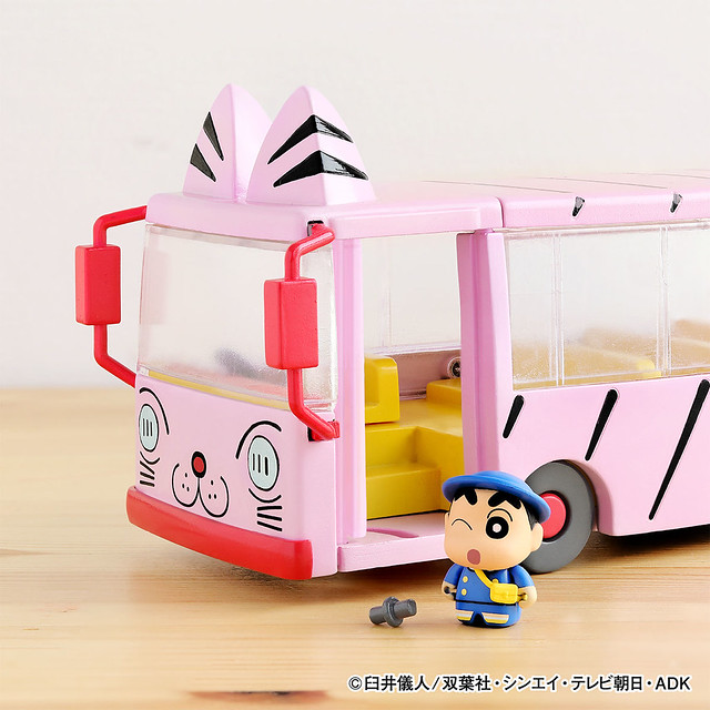 劇中接駁幼稚園孩子們上下學的「雙葉幼稚園巴士」實體化,推出可愛又趣味的巴士小車,貓咪造型的粉紅色巴士以約長10.5公分、寬約8公分的尺寸打造,除了造型還原,設計也相當精緻~為可動車輪,車頂與車門也可以拆卸,並附有穿著幼稚園制服的「這個角色コレキャラ」系列轉蛋公仔,共有春日部防衛隊的五位角色:小新、風間、妮妮、正男、阿呆,還有負責開車的園長~