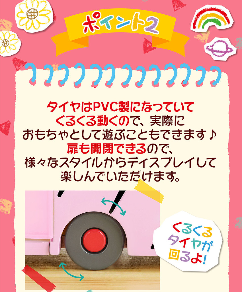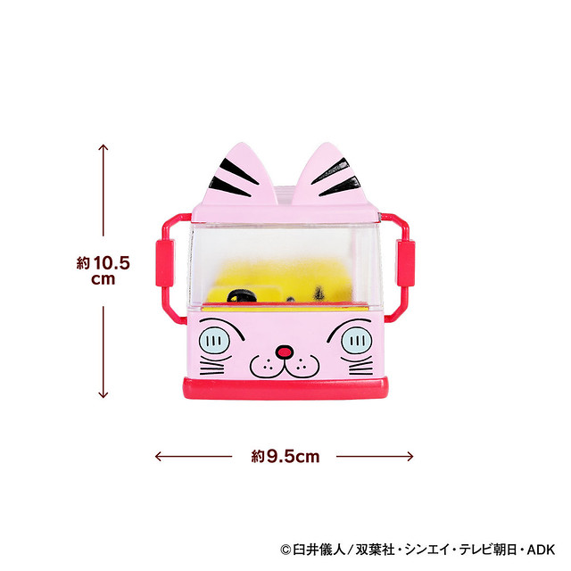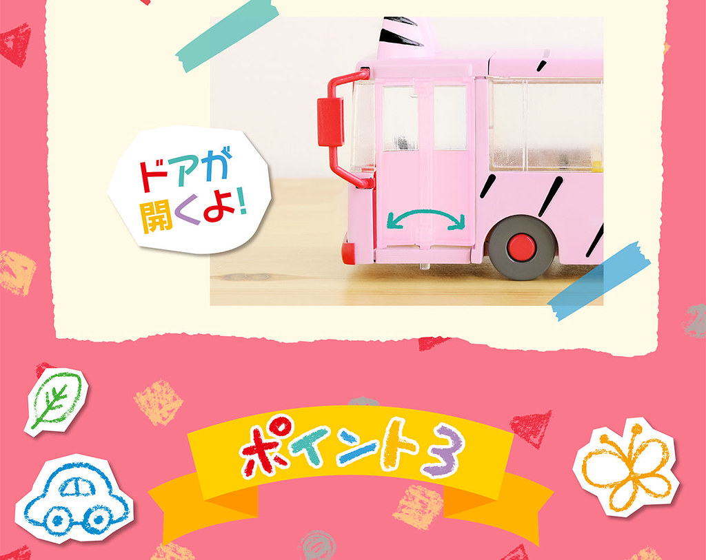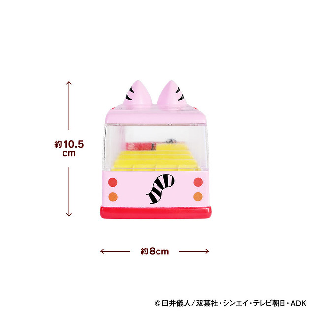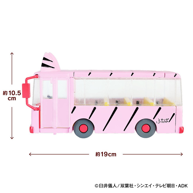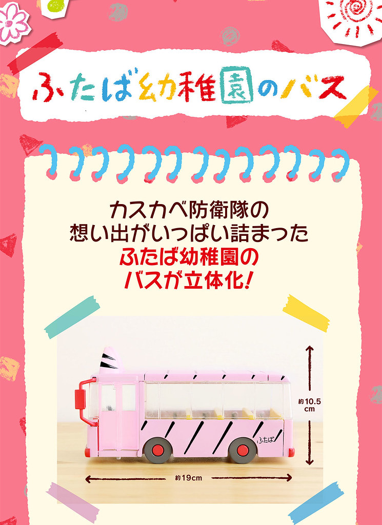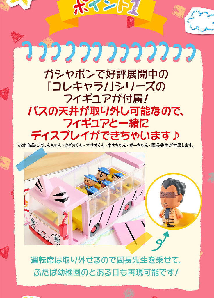 劇中接駁幼稚園孩子們上下學的「雙葉幼稚園巴士」實體化,推出可愛又趣味的巴士小車,貓咪造型的粉紅色巴士以約長10.5公分、寬約8公分的尺寸打造,除了造型還原,設計也相當精緻~為可動車輪,車頂與車門也可以拆卸,並附有穿著幼稚園制服的「這個角色コレキャラ」系列轉蛋公仔,共有春日部防衛隊的五位角色:小新、風間、妮妮、正男、阿呆,還有負責開車的園長~