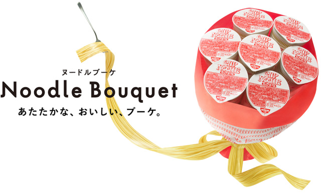 在日清食品的官網簡介,還說可以用在生日派對、情人節,或是求婚時送給對方…欸等等,求婚?認真的嗎?真的有人會拿這束泡麵去求婚的嗎XD?