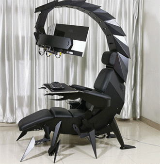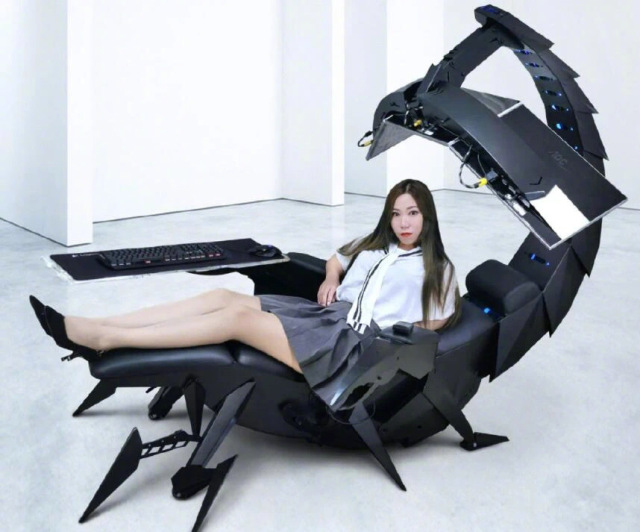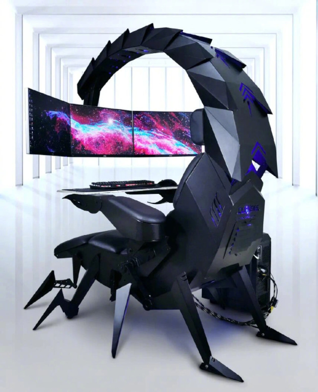 Cluvens廠商近期推出「天蠍座」電競座椅「Cluvens Imperator Works IW SK Workstation Chair」,能夠到達170度伸倘角度,由八個支點平衡,可以使用遙控器控制尾部,如圖示安裝21-29英吋三螢幕,完成全視野的沉浸夢想,彷彿《機獸洛伊德》的 WILD-ZW04「毒蠍」。